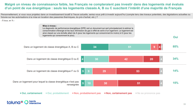 - Malgré un niveau de connaissance faible, les Français ne compteraient pas investir dans des logements mal évalués d’un point de vue énergétique : seuls les logements classés A, B ou C suscitent l’intérêt d’une majorité de Français.