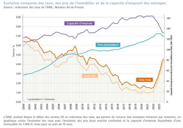 Source : Indice Prix INSEE (Logements anciens) & Taux historiques moyens.